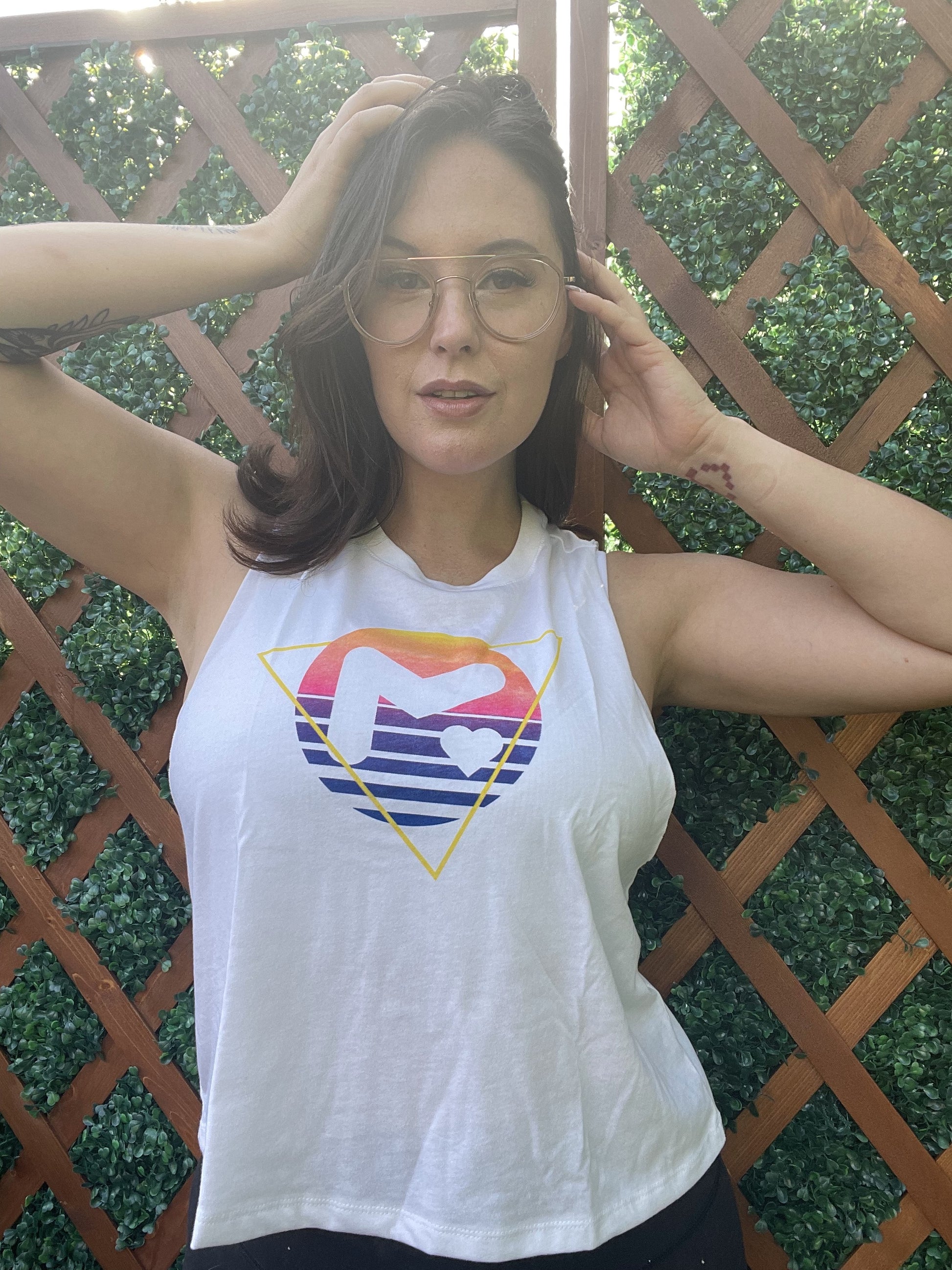 White Racerback Cropped Tank with a retro Sunset version of the classic M logo.